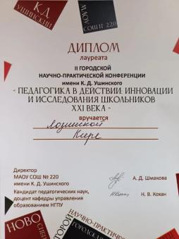 Победителем в секции «Педагогика и психология» стала ученица 8 «Б» класса Шрамко Елена, руководитель Соколова Татьяна Анатольевна.