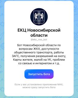 В рамках сотрудничества по организации консультирования граждан, обратившихся в Единый контактный центр Новосибирской области (далее - ЕКЦ), информируем о запуске нового цифрового сервиса - чат-бота ЕКЦ на платформе национального мессенджера MAX.